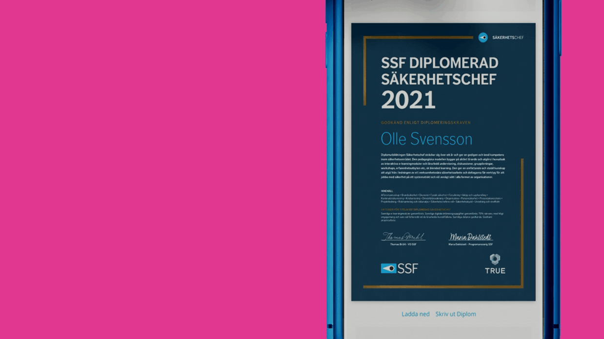 SSF Stöldskyddsföreningen har över 60 års erfarenhet av att genomföra säkerhetsutbildningar som ger våra kursdeltagare praktiska verktyg för att skapa en trygg och säker arbetsplats. Du som går eller har gått våra utbildningar kan verifiera din utbildning med ett digitalt diplom. Diplomet är enkelt att dela på olika plattformar som exempelvis LinkedIn.